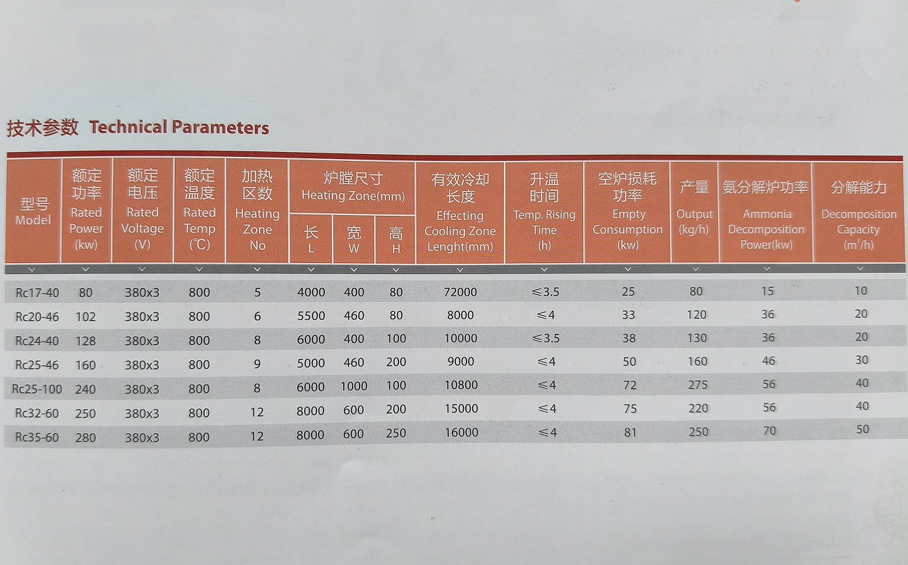This device is mainly composed of transmission system, heating system, cooling system, controi system,and ammonia decomposition gas supply system. The muffle is made of imported high-temperatureresistance nickel alloy by pressing welding; dismountable electric heating elements can pperiowe neasteel belt conveying is stepless speed regulating; the gas mixture(hydrogen 75% and axygen 259decomposed from liquid ammonia gets into the hearth and reaches gas protection effec tneluctdirection regulating device ensure stable atmosphere. Having treated by this kind of fumnetensurface will become bright and won't be oxidized, All treated products will reach excellent consistencys.